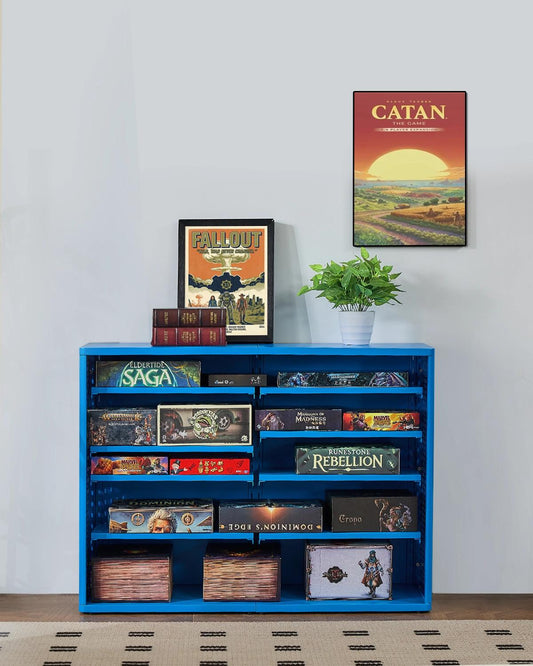 Modular game storage towers with adjustable shelves and expandable designs, built to organize large game boxes and growing collections.
