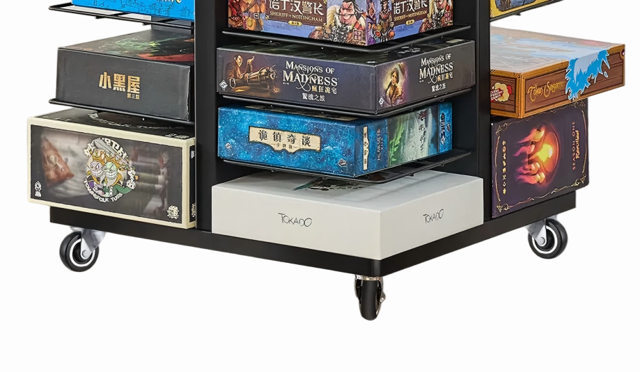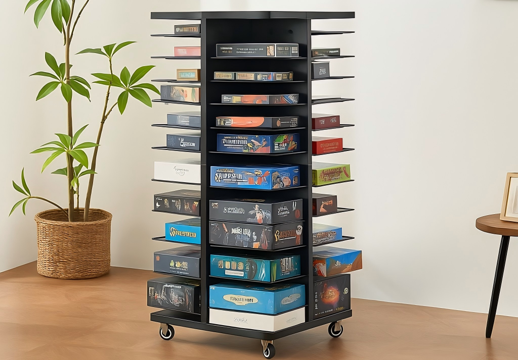 Easily access all your board games with the smooth-turning swivel base. Lockable wheels allow you to move the rack anywhere and keep it securely in place during use.