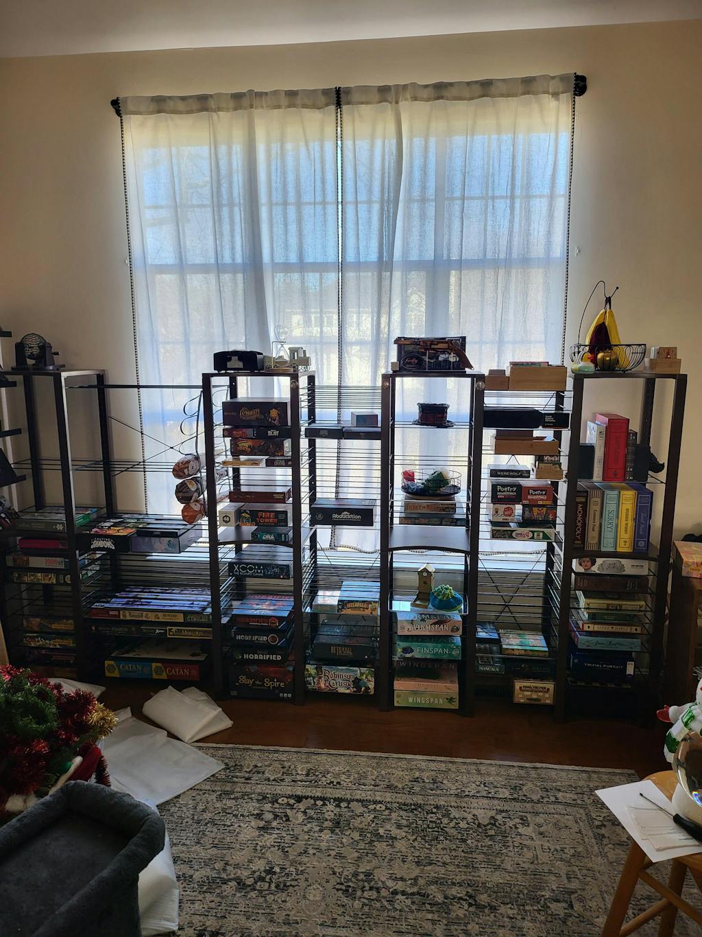 Stores even extra-wide games like Kingdom Death: Monster with 14 specialty 67.5cm shelves in a 157cm tall × 152cm wide space. No more leaving big-box games behind.
